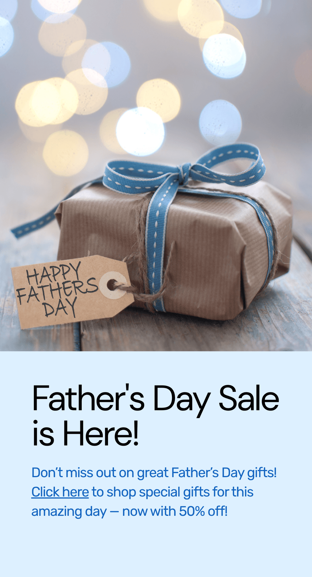 This section shares Father’s Day SMS campaign ideas to help businesses like yours promote discounts and special offers, build strong relationships with customers, and build brand equity. It also includes use cases and templates to inspire your campaigns.