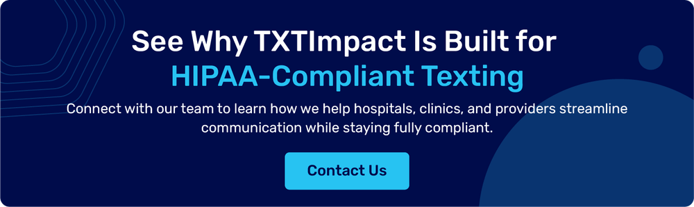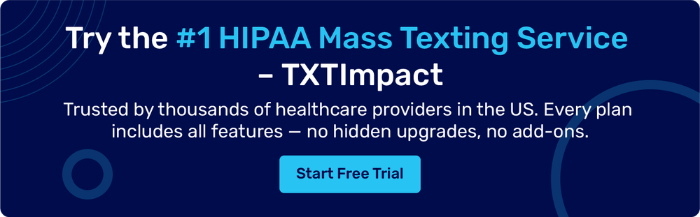 Need a HIPAA-Compliant SMS Solution?Start your free trial with TXTImpact and simplify your patient outreach today. |