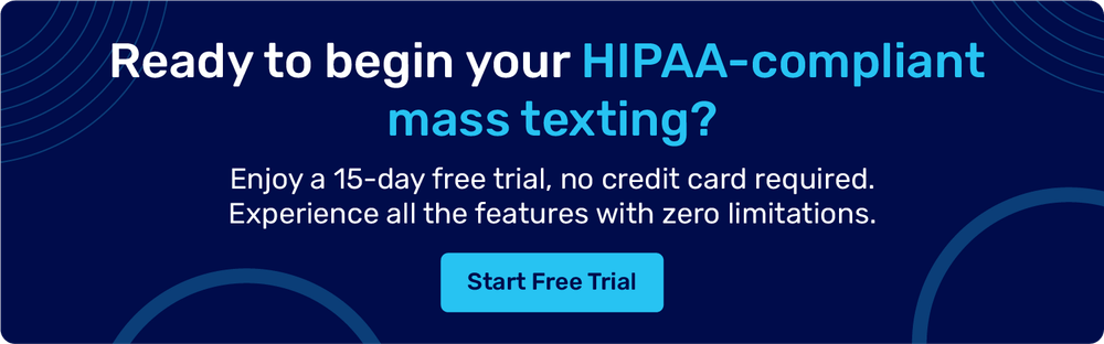 You can send HIPAA-compliant bulk texts using TXTImpact. Just sign up for a 15-day free trial and start mass texting your audience, all under HIPAA and TCPA guidelines.