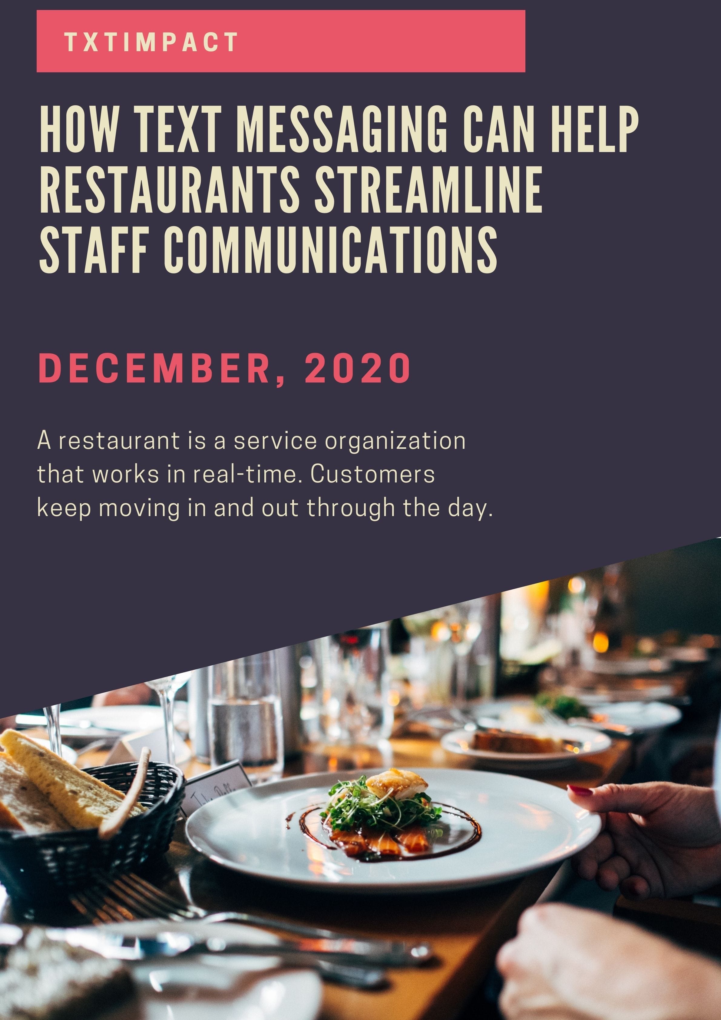 <h3>1) Communicate work schedules</h3> Work schedules are important in restaurants. Since the restaurant is open throughout the day, employees may work on shifts. Schedules need to be prepared and sent to employees so they know what duty they are assigned to. Waiters need to know the tables they are assigned to. The restaurant can use an <a href="https://www.txtimpact.com/excel-to-sms/">online text message</a> to send information on schedules to employees. All they need to do is type out the message and send it, and the message reaches them instantly. When employees go on leave or sudden schedule changes need to be made, it is more effective to send information through messages. <h3>2) Send updates</h3> Sending updates to staff members on information related to the restaurant is easy through text messages. <a href="https://www.txtimpact.com/mass-text-messaging/"> Mass text messaging</a> can be used to send updates to all staff. Messages related to any change in the restaurant operations, like a change in times or the introduction of a new menu, can be easily communicated through text messaging. Any important updates sent to customers can also be sent to employees so that they are aware of what is happening.Updates are needed on operational issues like inventory. Staff need to be aware of when materials will arrive. Updates on new designs or new pricing can also be easily sent through text messaging. Updates can also be sent by using the <a href="https://www.txtimpact.com/schedule-text-message/">schedule text message </a> option. This is helpful when messages need to be sent at frequent intervals. For example, the menu of the week can be sent through a message, and it can be scheduled so that reminders are sent daily to employees.