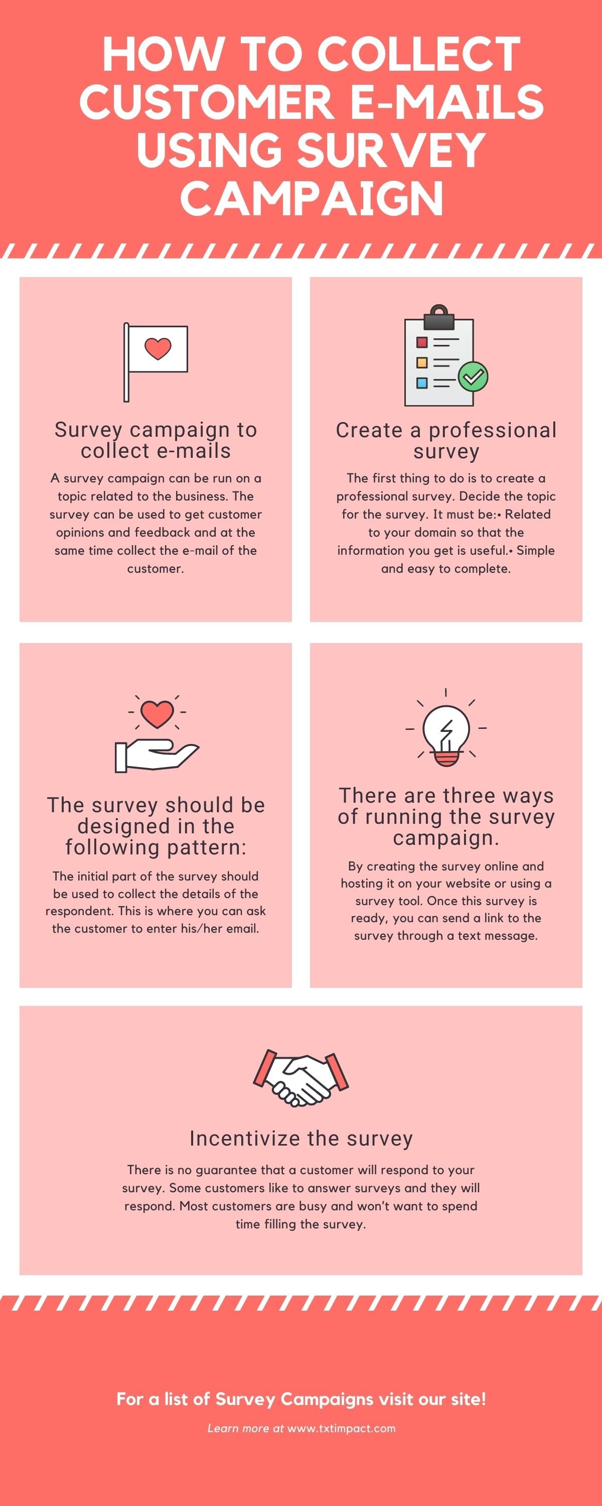 <h2>Survey campaign to collect e-mails</h2>A survey campaign can be run on a topic related to the business. The survey can be used to get customer opinions and feedback, and at the same time collect the email of the customer. Since the customer’s email is not available, a question would be how to send the survey to the customer. The answer is through texting. When the customer’s mobile number is available, then a text message can be sent to the customer inviting them to participate in a survey. This is a good way to run a survey and <a href="https://www.txtimpact.com/how-to-collect-email-addresses-video"> collect customer emails</a>. Here’s how you can do it: