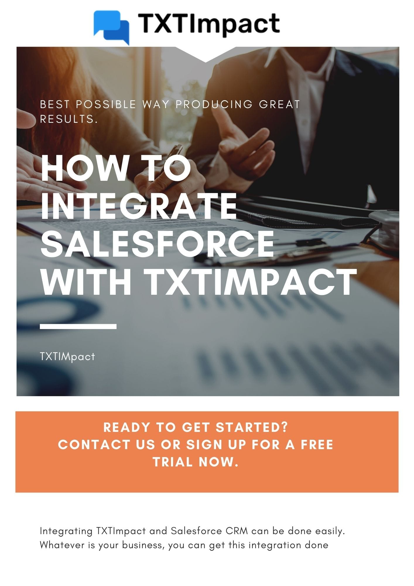 <h3>Carrying out the integration</h3>Integrating Salesforce CRM with TXTImpact is easy. The simplicity of the integration ensures that Salesforce and TXTImpact can be used to get the best results for your marketing. The following explains how this integration can be done effectively: