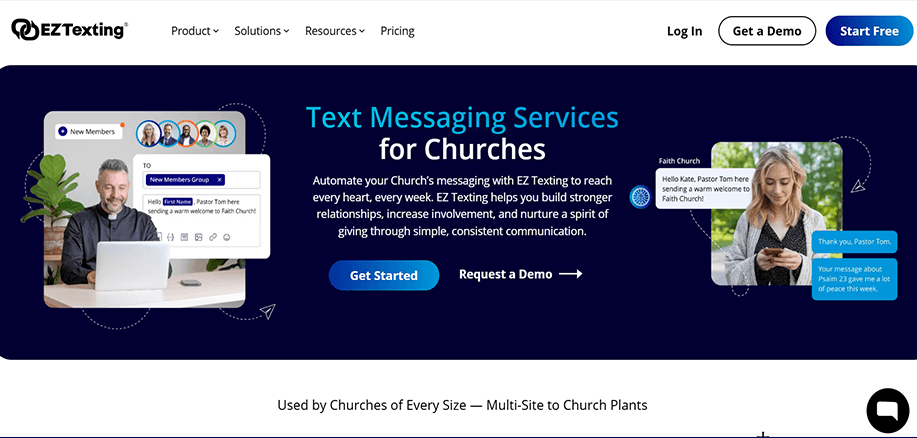 Churches of all sizes and Planning centers wanting to send personalized, promotional, and time-sensitive alerts and messages with advanced texting features without any compromise.