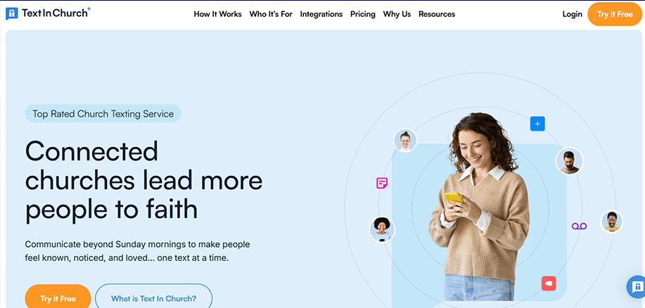 Pastorline | Automation, two-way texting, and security controls | Pastor-led engagement with text and voice communication | Starts at $15/month | ✓ Yes | ✓ Yes | Limited | Limited |
