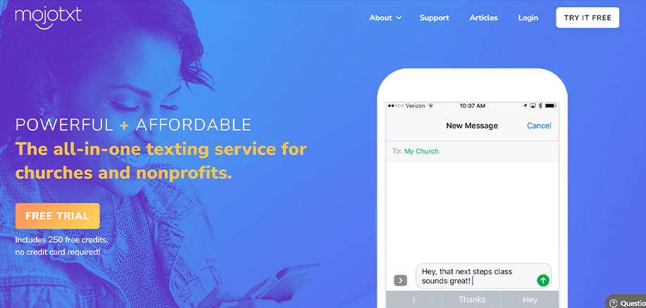 Mojotxt is an all-in-one texting platform designed specifically for churches and non-profit organizations. It comes with unlimited keywords, enabling businesses to create an infinite number of subscription lists, auto-responders, donation funds, live polls, and more, without paying a single extra cent.