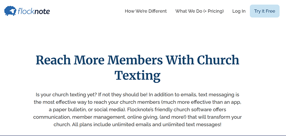 Flocknote | Unlimited texts and emails, volunteer management, and text-to-join | Budget-friendly churches | Starts at $10/month | Limited | basic | Limited | Add-on |