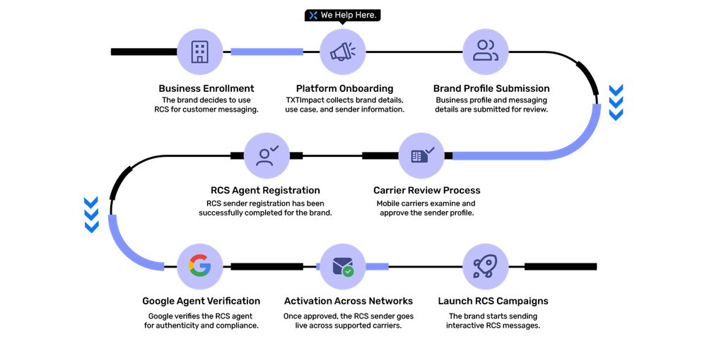 The RCS approval process validates this brand identity, ensuring it has permission to message users and that it follows compliance and carrier policies.