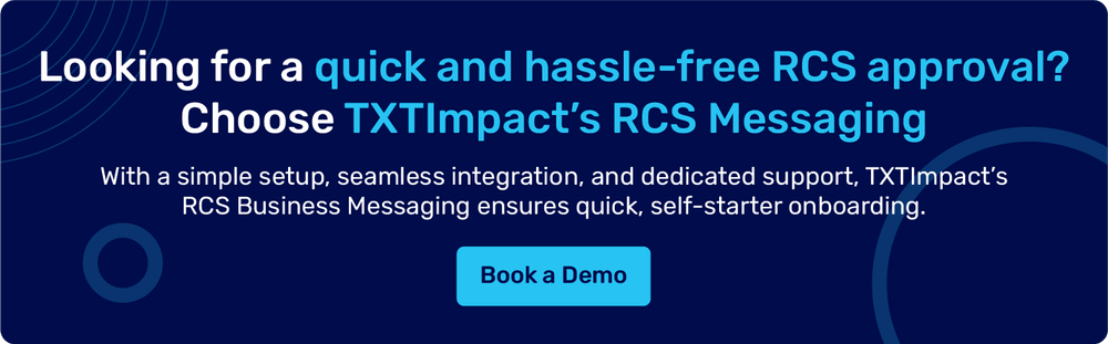 Choosing the right RCS provider can significantly streamline RCS approval for your business. If you’re looking for an RCS business provider, choose TXTImpact. TXTImpact’s RCS business messaging offers a simple setup and onboarding process, with features like seamless integration, ready-to-use templates, and comprehensive technical resources to ensure a hassle-free experience.