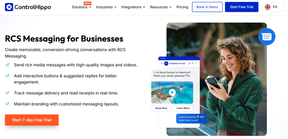 ControlHippo is a leading RCS messaging service provider that allows businesses to send rich media with high-quality videos and images, carousels, interactive buttons, and track read receipts and message delivery in real-time.