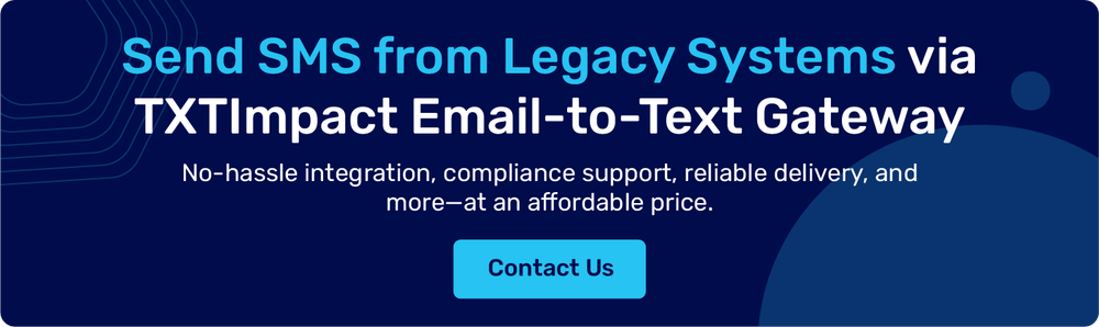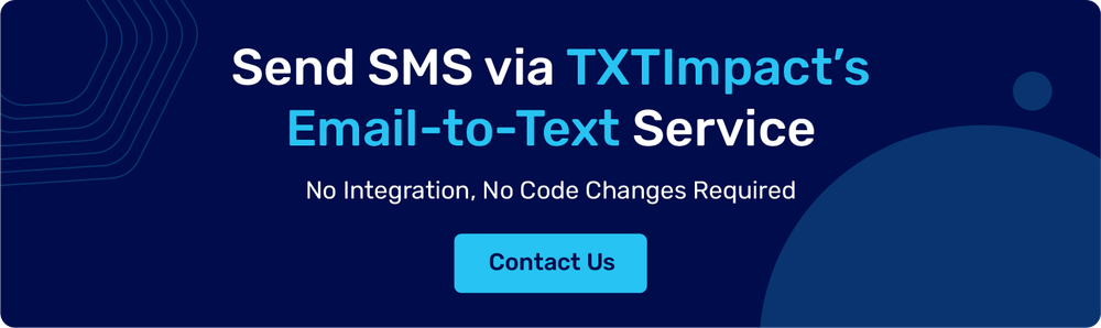 Previously, many businesses used carrier email-to-SMS gateways to send text messages. For example, Verizon users could receive messages at [email protected], while AT&T users used [email protected]. These gateways were popular in legacy systems because they required minimal configuration, no additional software development, and worked easily with existing on-premises email infrastructure. However, major carriers such as Verizon, AT&T, and T-Mobile have discontinued their email-to-SMS gateway services. Fortunately, businesses can still send SMS from email using platforms like TXTImpact’s Email-to-Text gateway, which provides a secure and reliable alternative without depending on carrier gateways. |