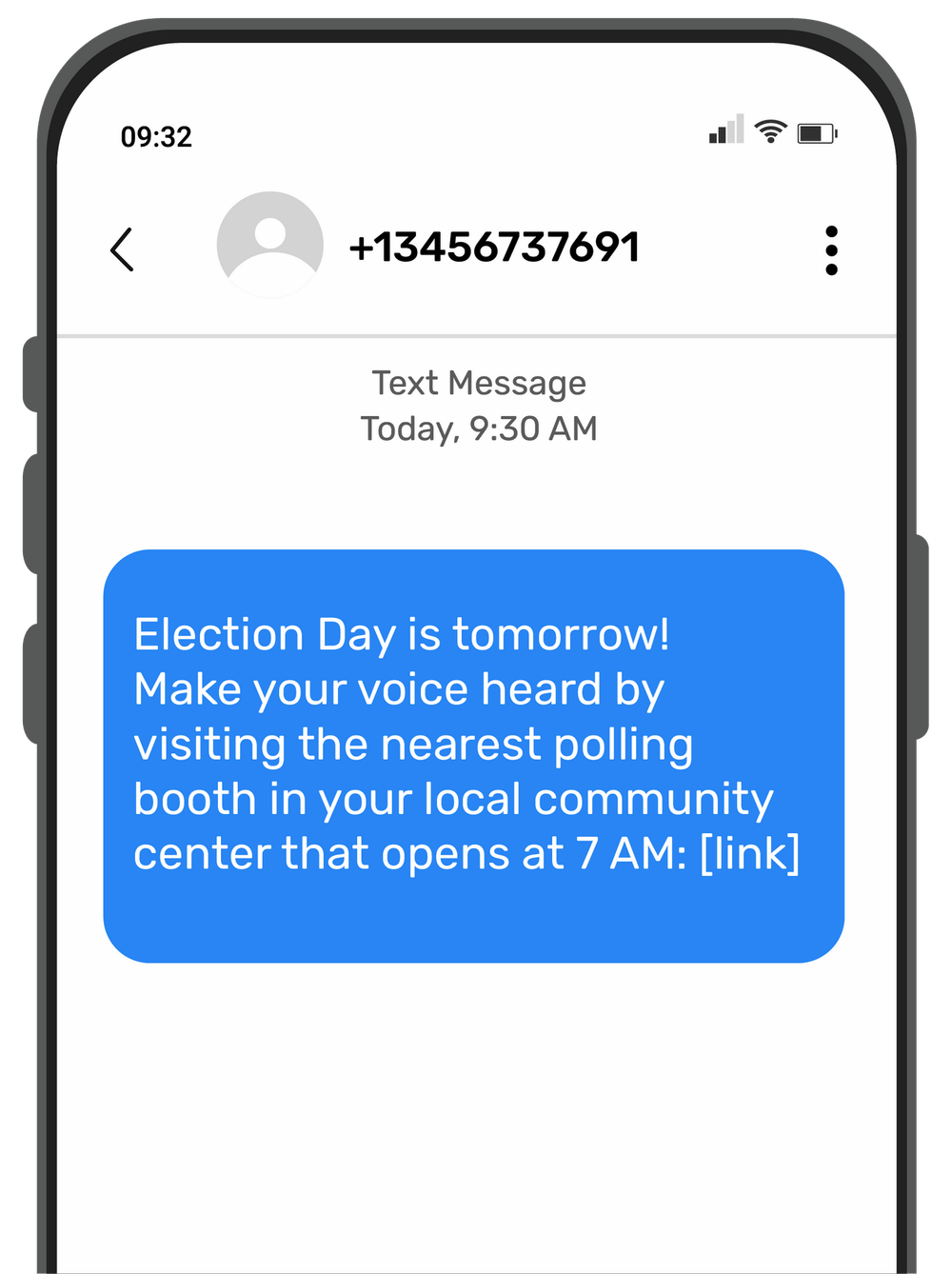 Example: “Election Day is tomorrow! Make your voice heard by visiting the nearest polling booth in your local community center that opens at 7 AM: [link]”