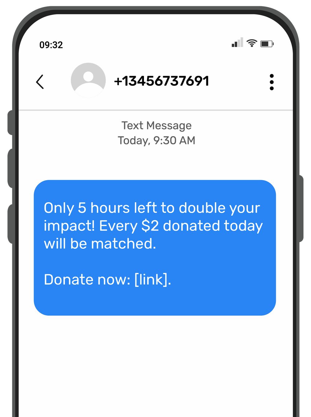Example: “Only 5 hours left to double your impact! Every $2 donated today will be matched. Donate now: [link].”