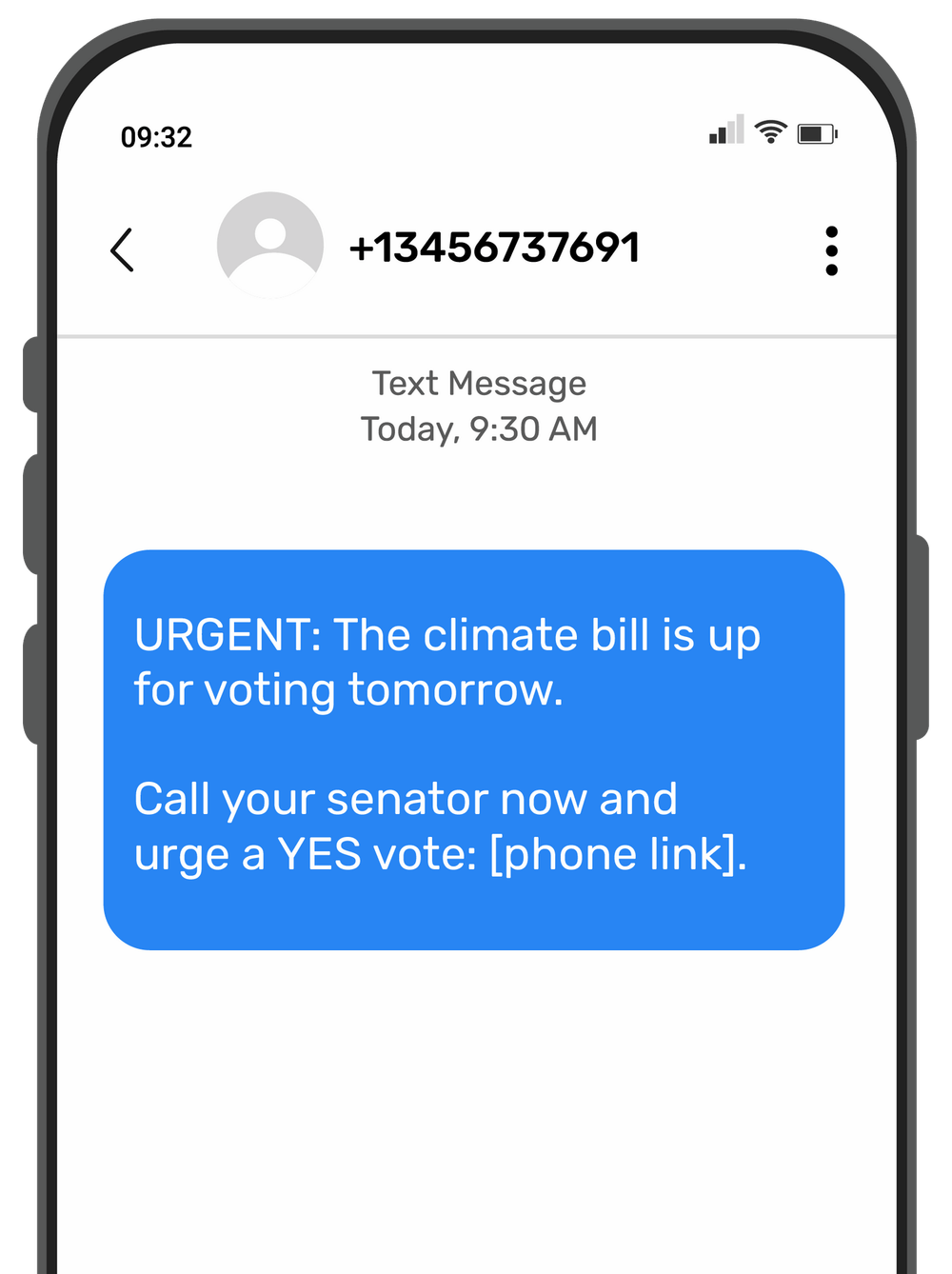 Example: “URGENT: The climate bill is up for voting tomorrow. Call your senator now and urge a YES vote: [phone link].”