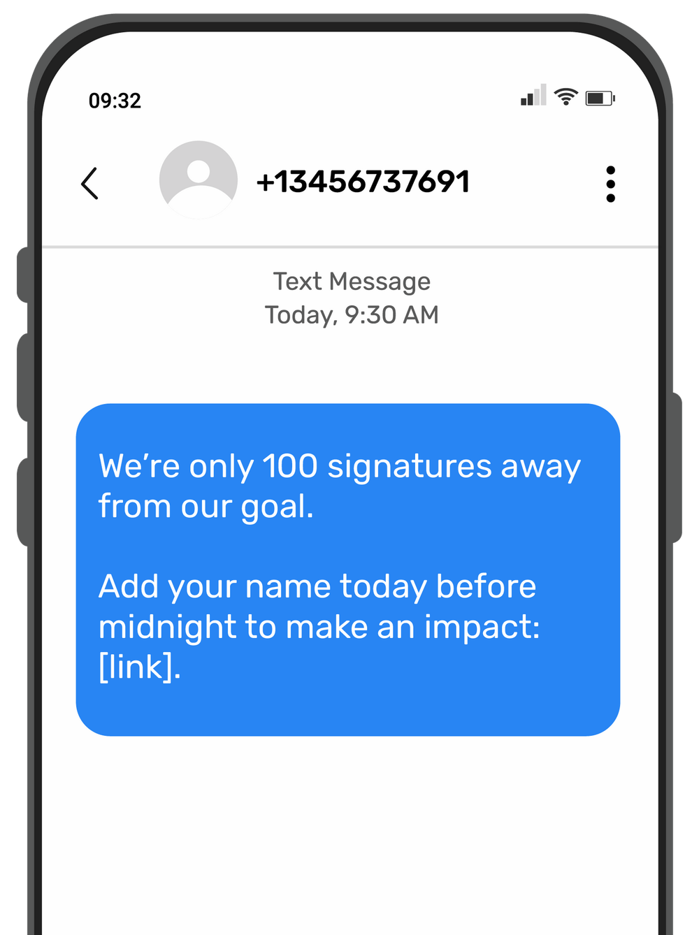Example: “We’re only 100 signatures away from our goal. Add your name today before midnight to make an impact: [link].”