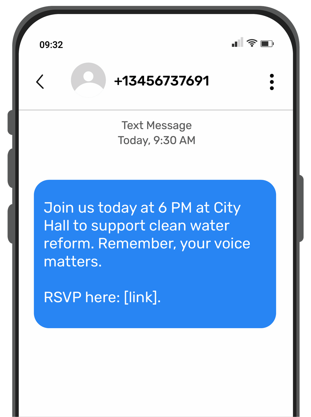 Example: “Join us today at 6 PM at City Hall to support clean water reform. Remember, your voice matters. RSVP here: [link].”