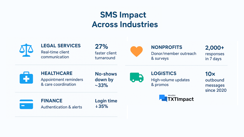 Cross-Industry Adoption: SMS has been adopted across different sectors, including legal, healthcare, nonprofit, education, tech, logistics, retail, finance, real estate, unions, etc.