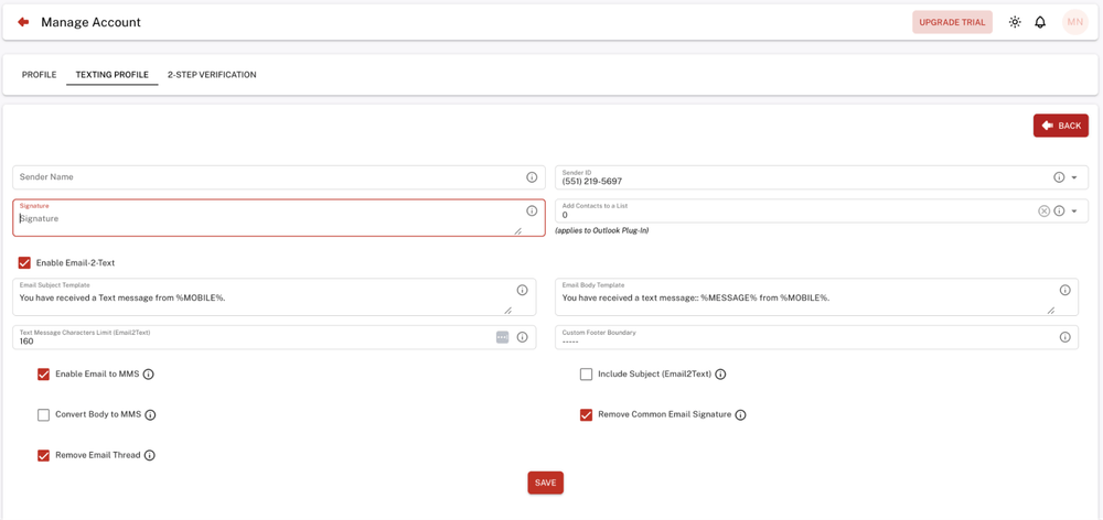 On the same Texting Profile, you will find an option to enable/disable the “Remove Common Email Signature” field. Just mark the check box to allow it to, and that’s it.