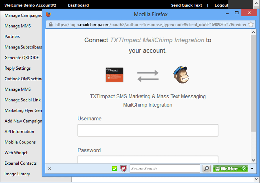 <h3>How to Connect MailChimp Account :</h3>In order to either join the MailChimp list using text message or to send a text message to the MailChimp list, the first step is to connect MailChimp Account and map the SMS campaign & MailChimp List.