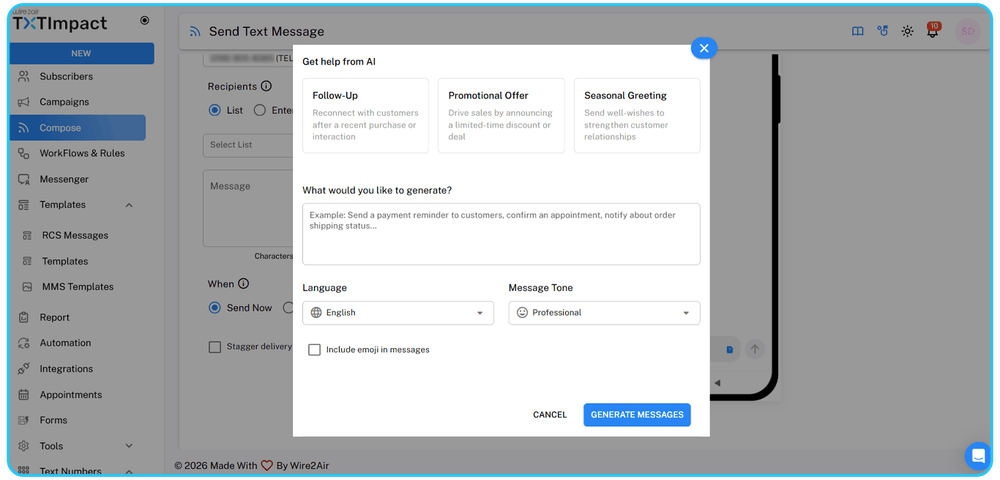 Omnihub offers an AI-powered message generator, called AI Assist, to help teams effortlessly create and optimize SMS, RCS, or WhatsApp messages instantly.
