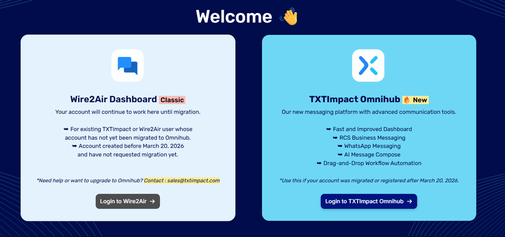 When users go to our login page, they’ll see two login options: Wire2Air Classic dashboard and TXTImpact Omnihub.