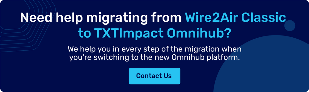 If you’ve been using the Wire2Air Classic dashboard, which has supported messaging operations over the years, it’s time to transition to the new and enhanced TXTImpact Omnihub platform, whose modern infrastructure is designed to meet today’s communication needs.
