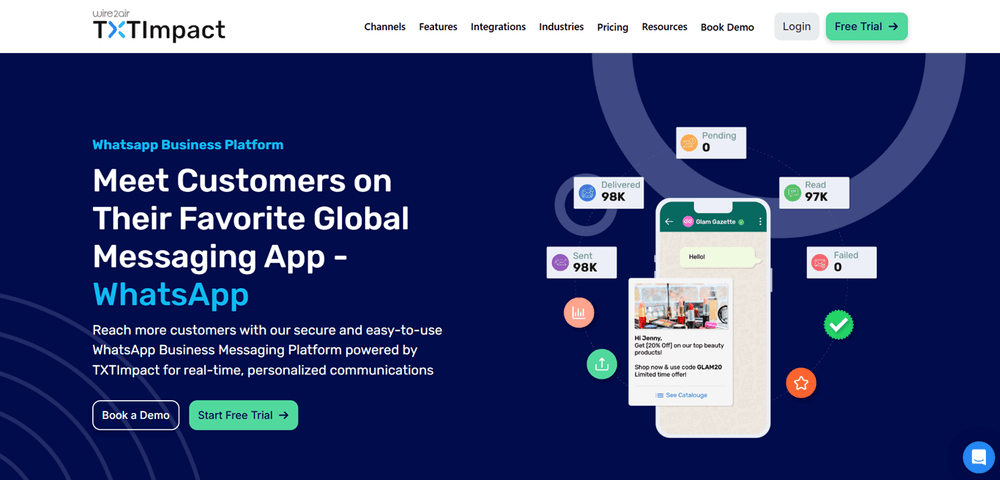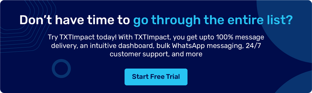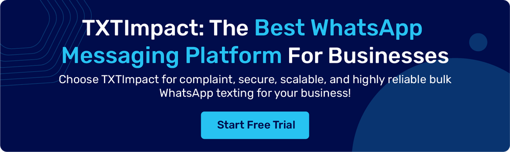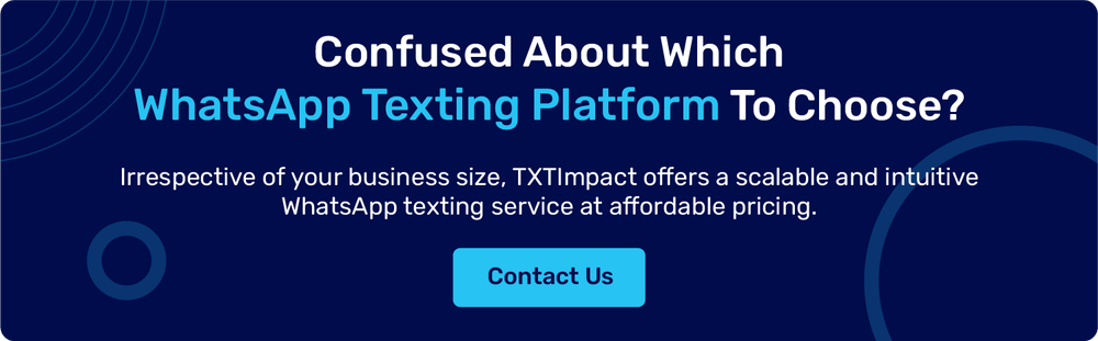 If you’re looking for a tool that offers all the reliable messaging features at an affordable price, TXTImpact is the right choice. TXTImpact’s WhatsApp messaging platform offers an intuitive dashboard, advanced analytics, personalization capabilities, scalability, two-way messaging, and a compliance-ready solution for businesses of all sizes.