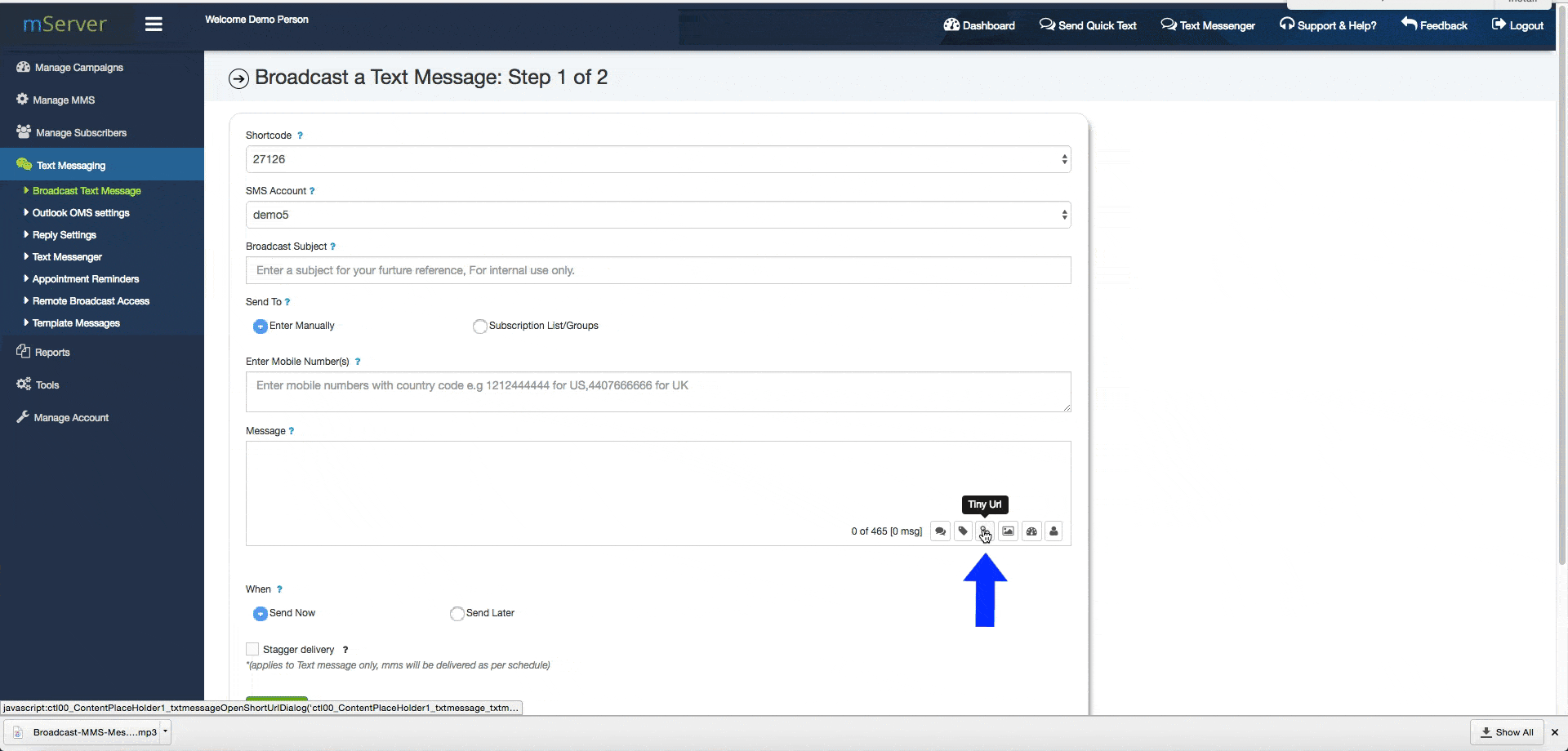 With our texting platform, you will find a handy URL shortening tool whenever you have to compose a text message either in the mass texting service or any of your SMS marketing campaigns.