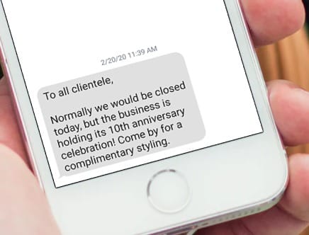 Texting allows you to relay information about special events and provide deals right to your customer's phone. Texting is the most checked form of communication which makes it an excellent choice to send this kind of information.